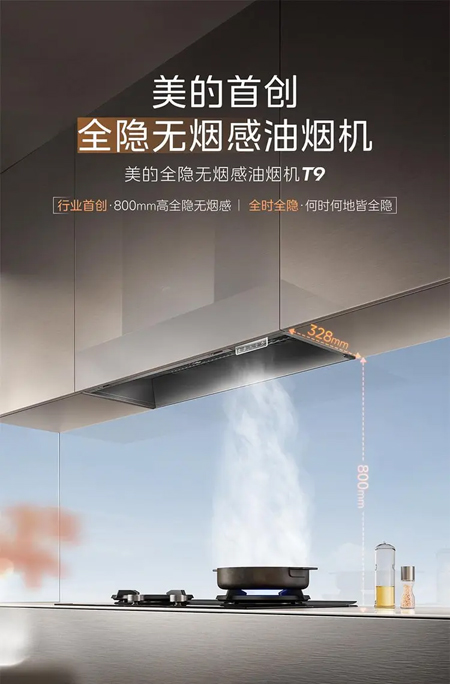 為此,美的對油煙機形態進行了重新設計,推出了全隱無煙感油煙機T9.安裝極限高度可以達到800mm(中國櫥柜的普遍高度在600-800mm之間)。