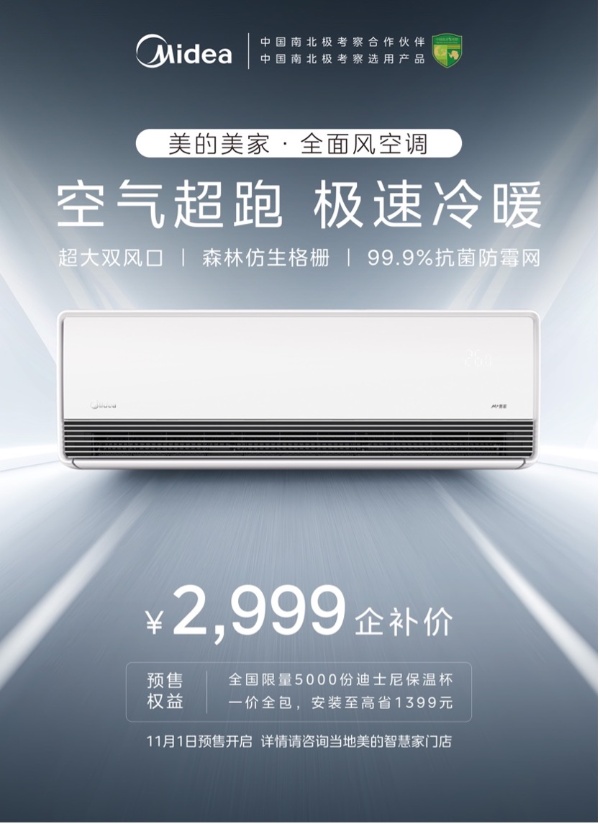 美的全面風空調預售活動于11月1日在“美的智慧家”門店全面啟動。本次預售專享企業補貼價低至2999元,并推出“限量贈送迪士尼保溫杯”及“一價全包安裝服務” 等多重專屬權益,以一步到位的誠意,助力消費者輕松升級居家生活品質。