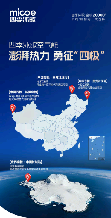 而這些只是四季沐歌“勇征四極”的一個縮影。憑借硬核技術與系統可靠性,四季沐歌空氣能已覆蓋中國乃至全球最具挑戰性的地理坐標,從神州邊陲到地球盡頭,“四極”不僅是地理概念,更是對產品極限性能的終極驗證場。而四季沐歌,正以扎實的技術底座,一次次將“不可能”變為“已運行”。