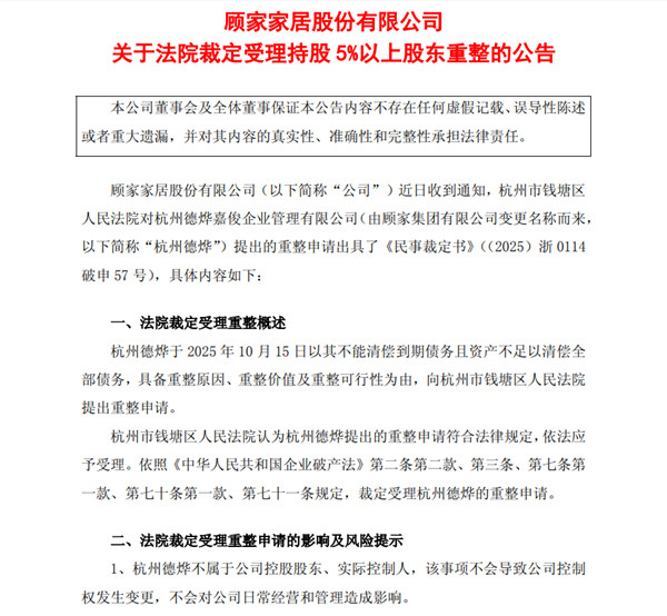 顧家家居公告表明,此次重整事宜不會對顧家家居的控制權造成影響。杭州德燁并非顧家家居的控股股東,也非實際控制人,所以不會引發該公司控制權發生變更。此外,公告還明確表示,即便股東層面的重整正在推進,顧家家居的經營活動仍會正常開展,不會因股東重整事項而受到干擾。