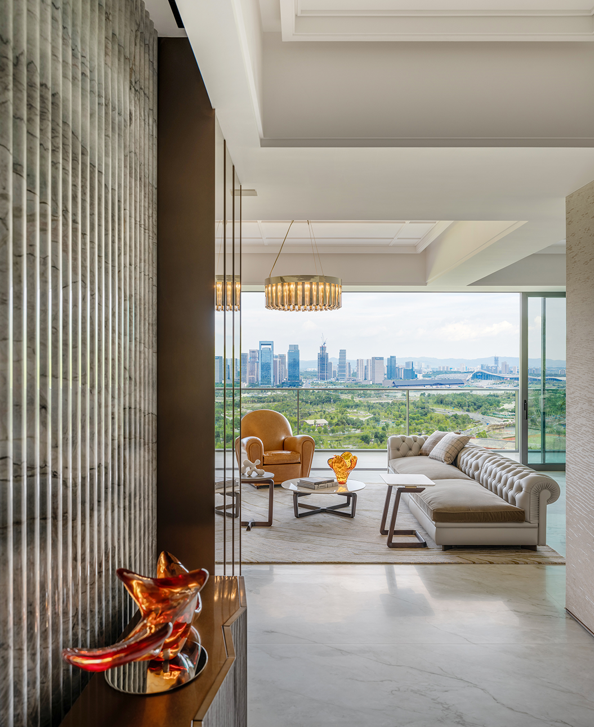 作為LACADIERE蔚藍城市控股旗下的第三座超級豪宅傳世之作,天覽以當代建筑語言回應東方居住哲思,于城市天際線構建自然、藝術與生活交融的空中墅居。步入天覽650㎡一層一戶的奢居空間,玄關以流暢的動線自然銜接中央會客廳,巨幅玻璃移門將自然景致巧妙引入室內,賦予空間從容氣度。客廳以簡約線條與克制色彩,構建出既能承載日常生活,亦可安放精神需求的場域。在偏廳延伸而出的影音區,深色皮革與木質飾面碰撞出內斂雅致格調,靜謐的氛圍悄然隔絕外界喧囂,為品酒洽談及影音鑒賞提供理想場域。