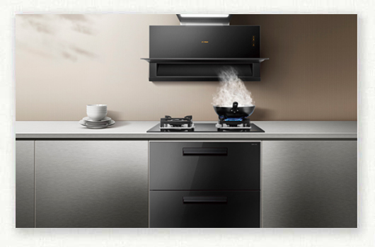 “中國新廚房,老板四件套”,產(chǎn)品中集合大吸力油煙機、紫焰強火